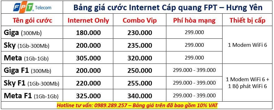 📌 Bảng giá các gói cước lắp mạng FPT Hưng Yên bao nhiêu?