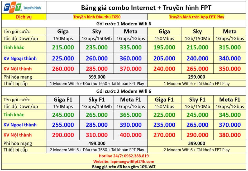 3. Bảng giá cước Internet và Truyền hình FPT